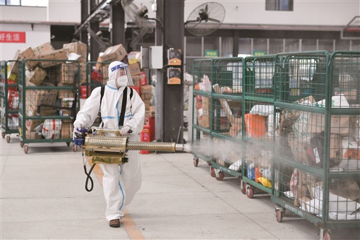8月21日,张家界邮政分公司邮件处理中心,工作人员对快递包裹进行消杀防疫。疫情期间,该邮件处理中心日均处理防疫物资、药品急件等邮件1万余件,处理中心场地每日消毒至少3次,确保所有邮件安全。 向韬 摄