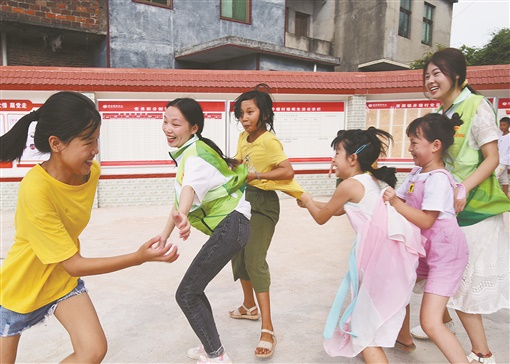 8月24日,嘉禾县晋屏镇井塘村,大学生志愿者与留守儿童玩游戏。当天,该县团委组织10余名返乡大学生走进井塘村,通过讲故事以及丰富的游戏活动,让留守儿童感受多彩快乐假期生活。