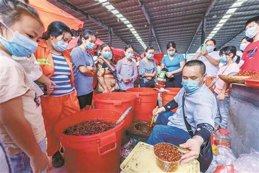 8月26日,吉首市乾州农贸市场,市民在购买现擂干辣椒粉。当天,该市在做好疫情防控的基础上,恢复乾州农贸市场开放。该市场是湘鄂渝黔四省市边区规模最大、品种最多、服务配套最齐全的多功能全天候综合型批发兼零售市场。 彭璟 摄
