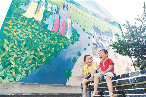 8月29日,浏阳市北盛镇卓然村,小朋友们在墙画下玩耍。今年,该镇全域实施美丽宜居村庄建设行动,涉及10个村、18个自然屋场,农村人居环境高质量得到提升。