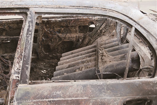 8月30日在阿富汗喀布尔拍摄的毁坏的汽车,这辆汽车内部装有火箭弹发射装置,当日发射火箭弹后被毁。