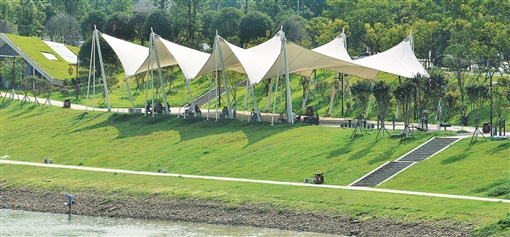 “生态”是资江风貌带建设中的重中之重。建设方益阳中交二航建设发展有限公司和施工方中交二航局益阳资江风貌带及城市西环线建设综合工程项目总部在资江风貌带建设过程中,结合新时期生态城市要求,按照“海绵城市”理念建设,以“慢排缓释”和“源头分散”控制为主,强调优先利用植草沟、雨水花园、下沉式绿地等“绿色”措施来组织排水,下雨时吸水、蓄水、渗水、净水,需要时将蓄存的水“释放”并加以利用,在适应环境变化和应对雨水带来的自然灾害等方面更具弹性。同时对驳岸重点实施“竖改坡、直改曲、硬改软”。这样一改,可以使资江风貌带的绿地面积尽可能多一点,保证下雨时能吸水、蓄水、渗水、净水,天旱时又能将蓄存的水释放出来,在提高防洪能力的同时,能按海绵城市、生态城市建设的要求美化、亮化防洪大堤。按照“三改”原则正在推进中的资江风貌带,在保持河道100年一遇的防洪设防标准不变、水利设施防洪排涝的基本功能不变的基础上,还对河道进行生态、景观化改造,改善水生态水环境,把防洪堤建设和城市规划、绿化、排污等各个方面统筹考虑、有机衔接了起来。可以说,建设中的资江风貌带是益阳打造“海绵城市”、抓好“生态治水”的先行尝试,在生态河道建设和水环境保护方面取得了新的突破。