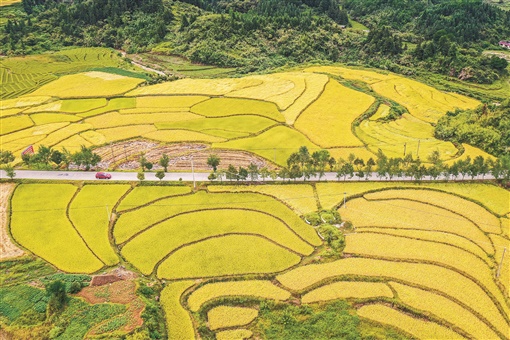 9月7日,蓝山县所城镇新山田村,车辆在乡道上行驶,沿途的稻田翻着金浪,好一幅秋日田园画卷。彭华 摄