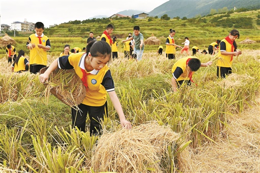 9月7日,洞口县山门镇里仁村,学生在捡拾被收割机遗漏的稻穗。当天,该县山门镇中心小学组织学生体验劳动的光荣和艰辛,倡导以节约为荣的生活理念。滕治中 米赛男 摄影报道