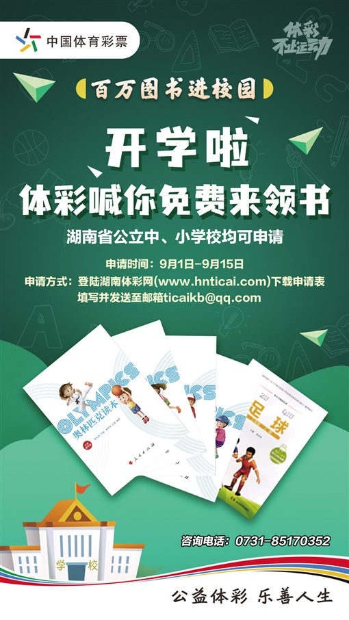 凡湖南省内公立中小学,对上述图书如有需求,自9月1日起可登录湖南体彩网下载申请表,按要求填报表格并发送至指定邮箱ticaikb@qq.com,就有机会免费领取图书。申领时间截至2021年9月15日。省体彩中心将根据全省申报的情况为部分学校免费赠送《奥林匹克读本》、《足球》等图书,让孩子们能够了解体育和奥运的丰富知识,启迪他们的奥林匹克梦想。
