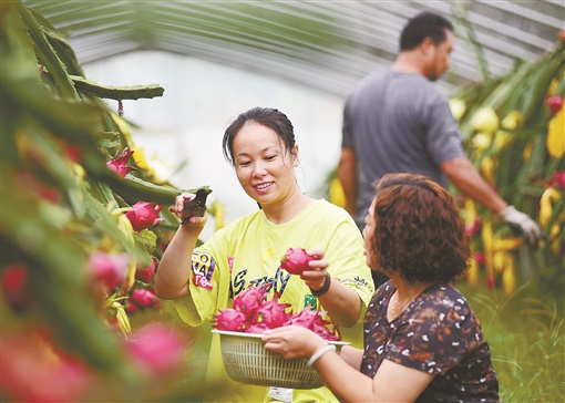 9月7日,嘉禾县珠泉镇车头村沙坪自然村,游客在果园采摘红心火龙果。近年,该村通过成立火龙果种植合作社,聘请专家技术指导,实现规模化种植,带动农旅融合发展,促进村民增收。