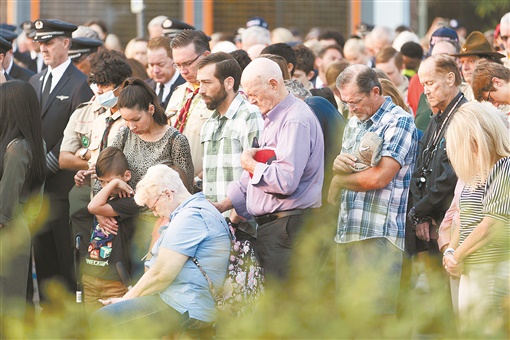 9月11日,美国多地纪念“9·11”恐怖袭击事件二十周年。图为当日,在美国得克萨斯州格雷普韦恩市的“9·11”纪念广场,民众为“9·11”恐怖袭击事件遇难者默哀。