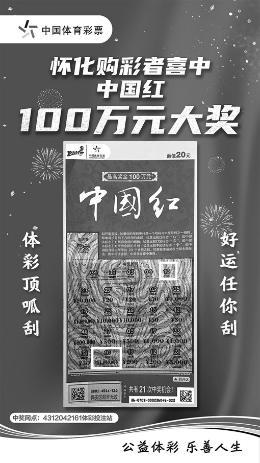 面值20元的体彩顶呱刮“中国红”彩票,票面典雅大方,由中国红和传统中式花纹构成,共有21次中奖机会,最高可中100万元!刮开票面上覆盖膜,中奖号码与你的任意号码相同即可中奖,奖金兼中兼得!