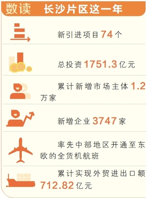 中非经贸合作促进创新示范园建成使用,黄花综合保税区二期封关运行。自贸总部基地、三一科学城等28个功能性平台正稳步推进。片区累计新增市场主体1.2万家、新增企业3747家。