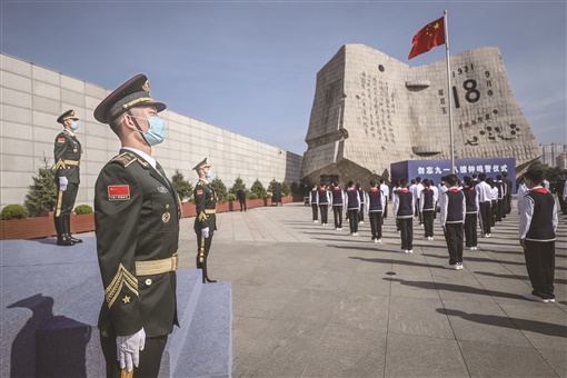 九一八事变发生90周年之际,勿忘九一八撞钟鸣警仪式9月18日上午在辽宁省沈阳市九一八历史博物馆残历碑广场举行。图为当日拍摄的仪式现场。