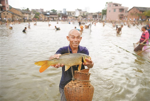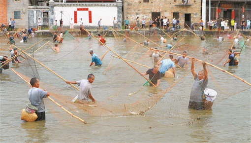 9月20日,江永县上江圩镇夏湾村,村民们欢聚一“塘”捕鱼。农历八月十四,是该村传承了500余年的传统习俗“捕鱼节”,全村男女老少带着捕鱼工具跳入池塘捕鱼,欢庆一年好收成。黄海 摄