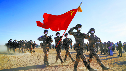 9月20日,“和平使命-2021”上海合作组织联合反恐军事演习正式开始。图为当日在俄罗斯奥伦堡州举行的演习开幕式上,中方参演部队接受检阅。新华社发
