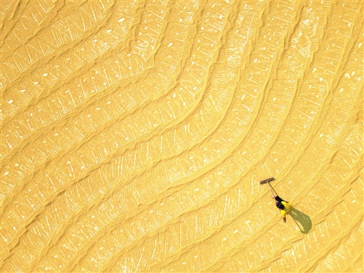 9月10日,双峰县井字镇洪泉村,农民在晾晒稻谷。秋收时节,该县中稻喜获丰收,当地农民抢抓晴好天气晾晒稻谷,确保颗粒归仓。 李建新 摄 |
