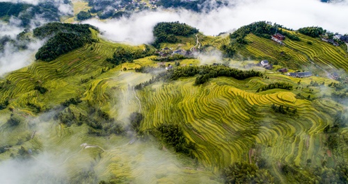9月18日,娄底市紫鹊界梯田风景名胜区,金秋的稻谷将梯田渲染得热闹非凡,景美如画。 罗中山 摄 |