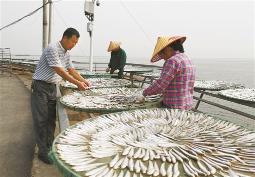 店外,员工李星正在翻晒筛盘中的鱼。“以前在家里只种些蔬菜,现在多了一份收入,每天能多赚120元。”她笑着告诉记者,“离家也近,老公早晚接送,小日子更滋润了。”
