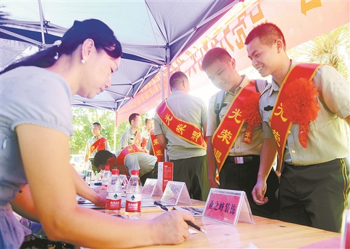 9月23日,嘉禾县退役军人事务局,工作人员向退役士兵介绍招聘信息。当天,该县举行退役军人专场招聘会,组织20多家企业提供160多个岗位,为70多名退役士兵送上就业“大礼包”,帮助他们尽快实现就业。黄春涛 摄