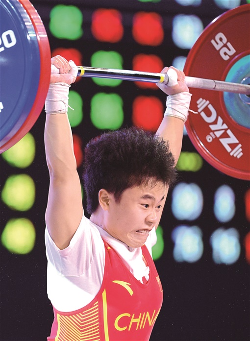 9月16日,侯志慧在比赛中。桂阳妹子侯志慧以抓举96公斤、挺举118公斤,总成绩214公斤超世界纪录夺得冠军。
