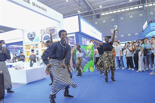 ②9月28日,长沙国际会展中心,观众在卢旺达展区观看舞蹈表演。