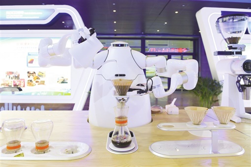 ③9月28日,长沙国际会展中心江西展台,机器人表演冲泡咖啡。
