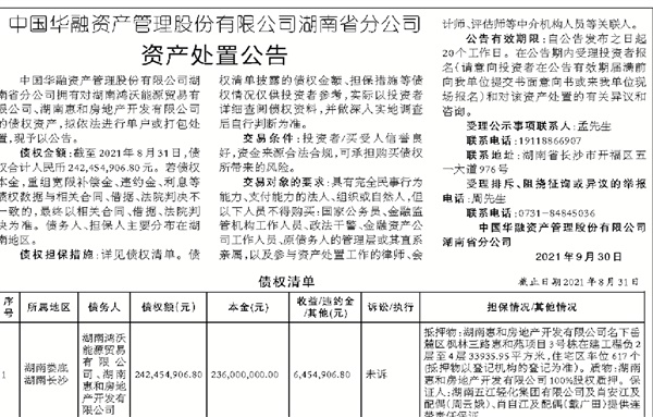 中国华融资产管理股份有限公司湖南省分公司 资产处置公告