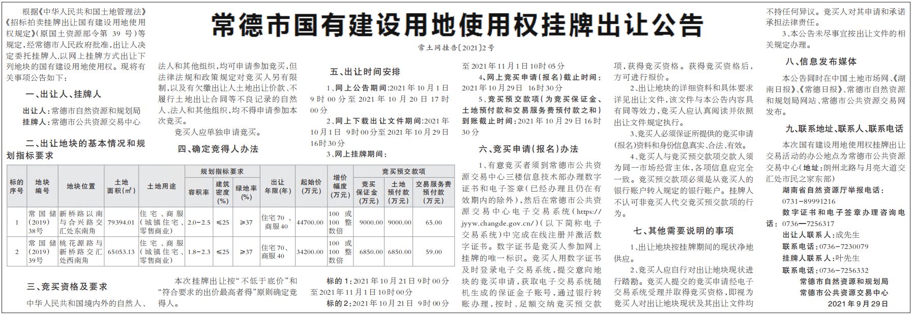 常德市国有建设用地使用权挂牌出让公告