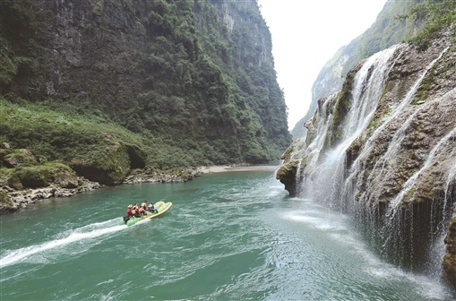 10月3日,游人在张家界市茅岩河风景区体验水上漂流项目。国庆假期,张家界市高温晴热天气持续,素有“百里画廊”之称的茅岩河风景区水上漂流项目备受游人青睐,游客在碧绿清澈的茅岩河上漂流冲浪,乐享假日休闲时光。 吴勇兵 摄