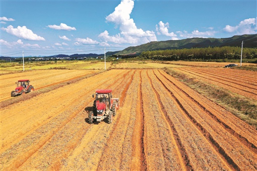 10月4日,宁远县水市镇黄家村,农机手驾驶施肥播种一体机播种油菜种子。近年,该县加大油菜种植补贴力度,免费提供良种、技术指导,推广“稻-稻-油”“稻-油”全程机械化生产模式,鼓励农民种植油菜增收。