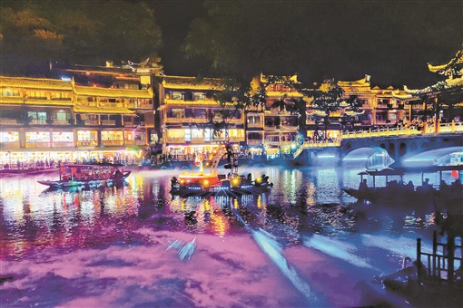 10月3日晚,游人乘坐艺术游船在凤凰古城体验沱江夜游。沱江两岸,灯光璀璨、霓虹闪烁、色彩斑斓,水中倒影,如幻如真,游客徜徉其中,似在画中游。 刘杰华 摄