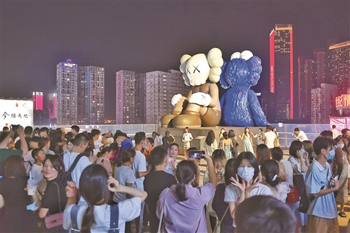 10月4日晚,长沙国金中心,游客排队打卡拍照。国庆假期,长沙市区夜晚灯火辉煌,热闹非凡,长假带来的顶级游客流量再度点燃长沙火爆的夜经济。