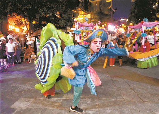 10月4日晚,吉首市乾州古城,民间艺人在表演蚌壳舞。国庆期间,吉首市开展“文旅融合 非遗进景区”活动,舞狮舞、玩蚌壳、跳花灯、彩龙船等民俗“非遗”文化精彩纷呈,丰富了广大市民和游客的节日文化生活。姚方 周晓燕 摄影报道