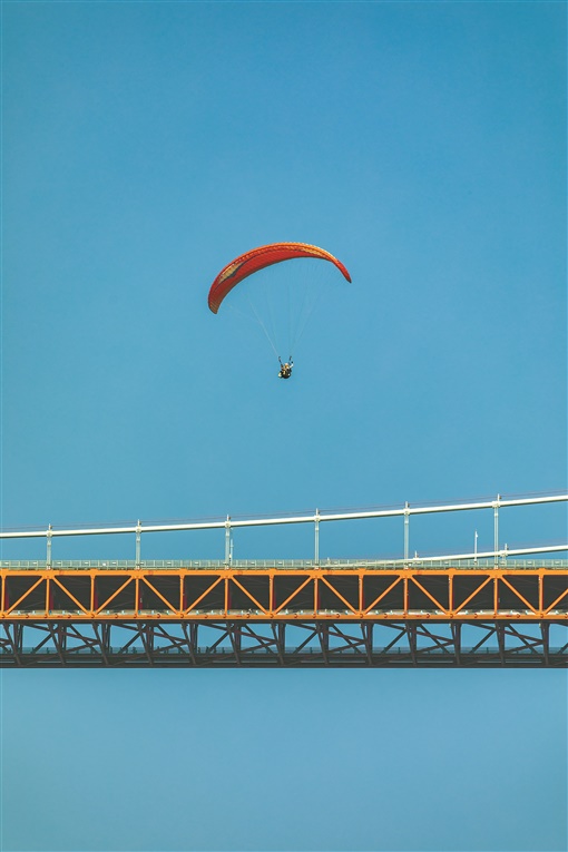 上图:10月6日,游客在吉首市矮寨特大悬索桥附近体验滑翔伞。国庆假期,各地游客纷纷来到吉首市参观旅游,放松心情,亲近自然,乐享假日好时光。刘振军 摄