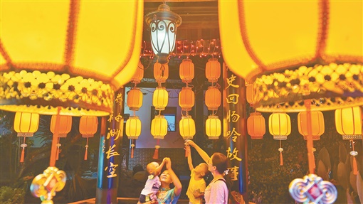 下图:10月6日晚,游客在宁乡市关山古镇游玩。国庆假期,关山古镇举办“三国不夜城”夜游节,游客观花灯、学典故,其乐融融。