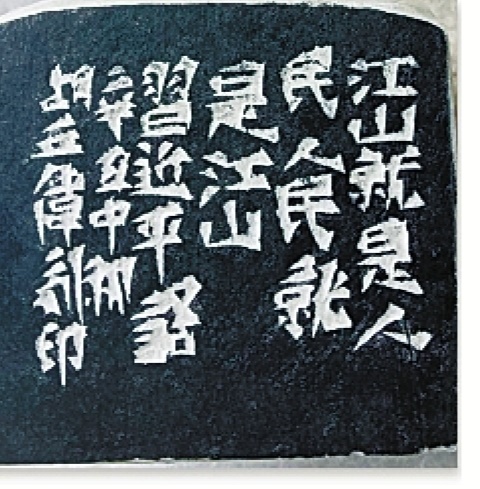 在胡立伟先生的工作室见到了他的“献礼”作品——一方有拳头大小的寿山石印章。细观篆刻文字排列,构思精巧,巧妙地将两句话,十二字融入六字之内,从左往右读“江山就是人民”,从右往左读“人民就是江山”。尤其,“山”字下的大块留红与“人”字下的大块留红,交相呼应,其刀法铁划银钩,纵横捭阖,刚劲有力。刀劈斧凿,大块留白颇具白石遗韵。他说,“篆刻是小众艺术,方寸之间,大千世界,亦可小中见大,也可揭示宏大主题。”