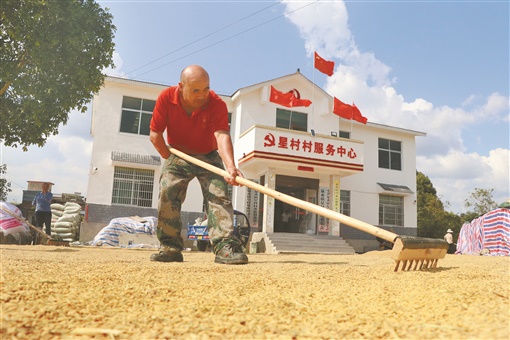 村委会前坪,几位村民正翻晒稻谷,1000多平方米的空地被铺得满满当当。