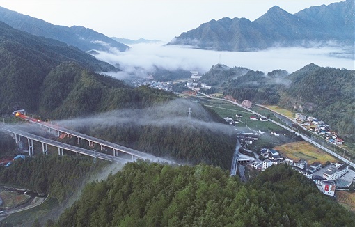 10月11日清晨,桂东县四都镇西靖社区,纵横交错的公路、薄薄的云雾、青山绿树、簇新民居等组成了生态好、产业兴、交通便利的现代新农村画卷。 邓仁湘 摄