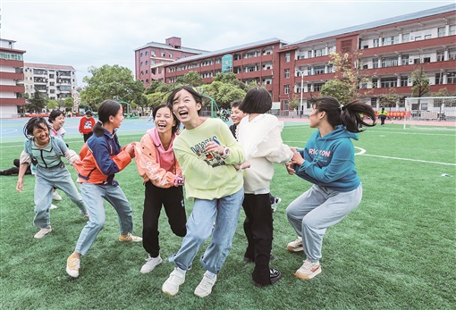 10月11日,麻阳苗族自治县民族中学,学生在课间做“老鹰捉小鸡”游戏。近年,该县在中小学开展“快乐课间运动十分钟”活动,让学生享受课间运动的快乐,增强学生体质。