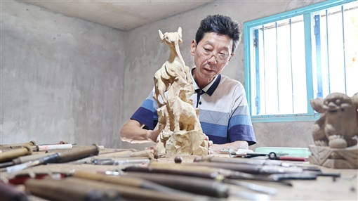 木雕作品题材多为花鸟、走兽和人物。龙是中国传统文化的象征,也是经常要塑造的形象,很难雕。“我雕龙最拿手。一条龙,驼头、鹿角、螃蟹眼,虾须、鸡脚、鲤鱼鳞,马尾、牛耳、蟒蛇身。神在眼、气在须、威在头、力在爪,身体要呈‘S’型。雕好细节,这条龙才能活灵活现。”朱德元说,这些艺术形象源自乡土生活之中。在农村生活的他,没事就观察这些动物。