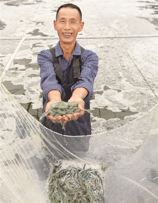10月13日,浏阳市沿溪镇大光园村南美白对虾工厂化养殖基地,工人展示南美白对虾。该基地通过工业化+循环水+智慧养殖,成功实现南美白对虾淡水化、本地化零污染养殖。目前,基地商品成虾年产量1.5万多公斤,年产值100多万元,吸纳周边农户20余人务工,人均年增收约3万元。湖南日报·新湖南客户端记者 唐俊 通讯员 宋洁洁 摄影报道