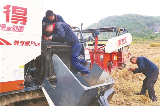 10月18日,新田县三井镇谈文溪村,农机技术人员在田间维修收割机。今年,该县组织农机售后维修工作人员成立志愿者服务团队,深入田间地头,维修保养农业机械。刘贵雄 摄