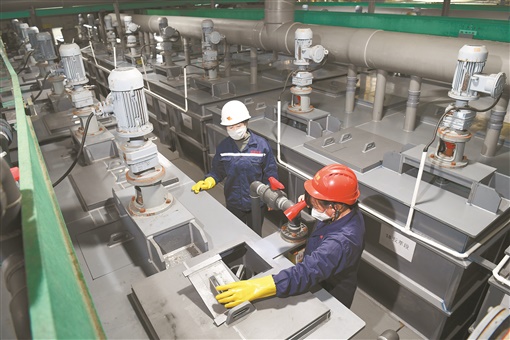 10月16日,安化县酉州工业园湖南金源新材料有限责任公司生产车间, 工人在巡视废旧电池萃取设备运行状况。该县循环经济已形成完整产业链,年回收加工钨钴废料14300吨、废旧电池5万吨。1月至9月,全县循环经济产值达17.68亿元,税收6689万元。