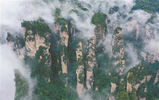 10月19日,雨后的世界自然遗产地张家界武陵源景区,云雾缭绕在山峦之间,构成一幅壮美的画卷,美不胜收。吴勇兵 摄