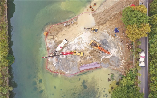 10月19日,永州市零陵区富家桥镇贤水河面上,工人在进行永零高速桥墩地下部分施工。永零高速起于永州市冷水滩区,止于零陵区富家桥镇,主线全长约59公里,预计2023年竣工。