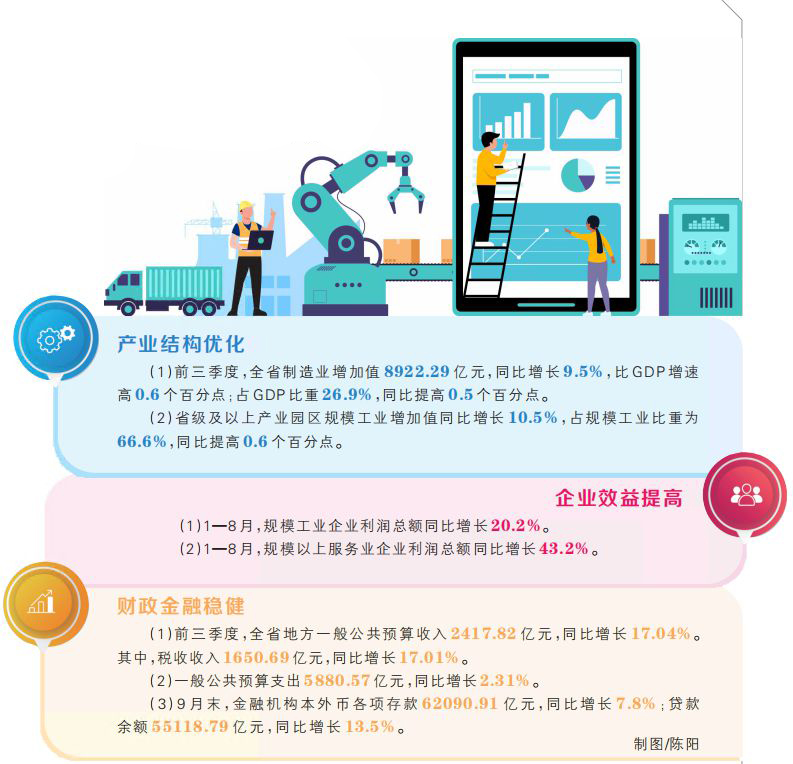 先进制造业加快发展、科技创新强力推进、开放发展迈出新步伐,推动经济结构进一步优化升级。前三季度,我省制造业增加值同比增长9.5%,两年平均增长6.4%,均高于同期GDP增速;省级及以上产业园区规模工业增加值同比增长10.5%,高于全省规模工业增速,且占规模工业比重提高,园区集聚优势进一步彰显,为实体经济和产业高质量发展提供主阵地。