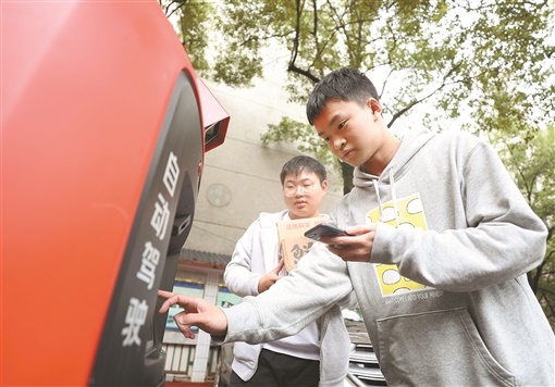 11月2日,大学生在无人驾驶快递车上取件。近日,物流公司把无人驾驶快递车开进南华大学,循环行驶在学校图书馆、食堂、学生宿舍周边,取件人可以全程人机交付,无接触方式带来了更安全、放心的快递服务。 曹正平 摄