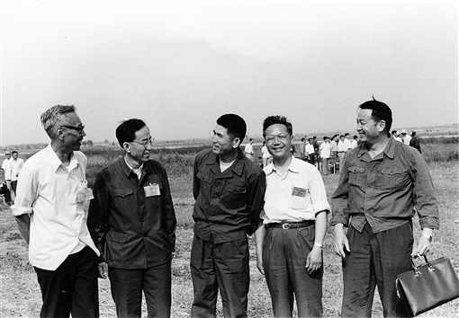 1984年6月12日,歼8II飞机首飞成功,总设计师顾诵芬(右二)等在首飞现场。均为新华社发