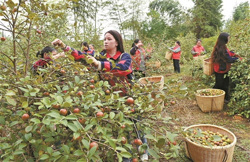 11月3日,洞口县竹市镇炉家村亿丰油茶基地,果农在采摘油茶果。近年,该县引导农民从事油茶生产,形成集种植、加工、销售一条龙产业链。目前,全县12.6万余亩油茶已进入采摘季,果农们抓紧采摘,确保增产增收。滕治中 摄