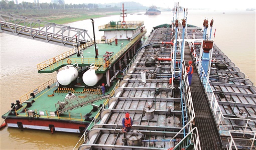 11月6日,岳阳石油七里山油库码头,员工忙着卸油。面对柴油供应压力,中国石化销售股份有限公司湖南岳阳石油分公司积极从南京、上海等地调进柴油,确保市场供应。 赵延智 余进 摄影报道