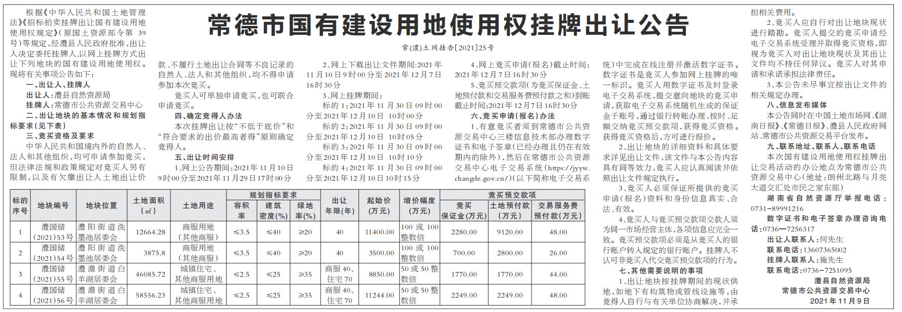 常德市国有建设用地使用权挂牌出让公告