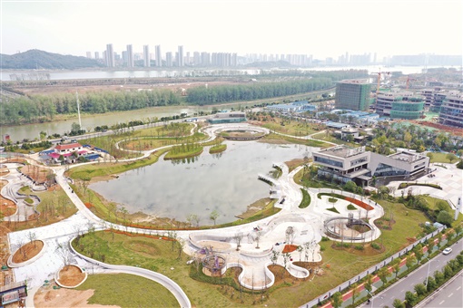 11月11日,湖南湘江新区星悦湖公园建设已基本完工,正在进行绿化等扫尾施工。该公园位于长沙市月亮岛路与潇湘北路交叉口东北角,占地面积约6万平方米,规划有5区16景,预计下月可建成开放。湖南日报全媒体记者 田超 摄
