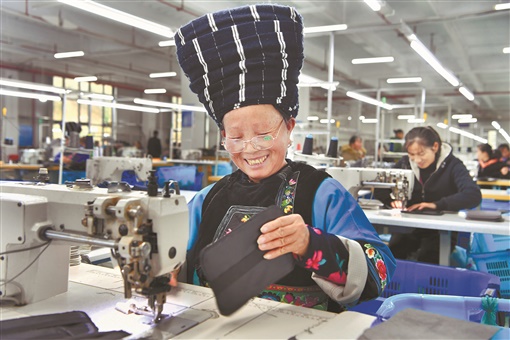 11月13日,苗族搬迁群众在凤凰县禾库安置区繁荣箱包厂就业车间作业。为确保搬迁群众稳定增收致富,凤凰县通过培育发展产业、开展技术技能培训、动员外出务工、办好就业车间、开发公益性岗位等形式抓实就业,助力群众“搬得出、稳得住、能致富”。目前,该县安置区已搬迁群众劳动力5193人,有就业意愿的4875人全部实现了就业。湖南日报全媒体首席记者 郭立亮 摄